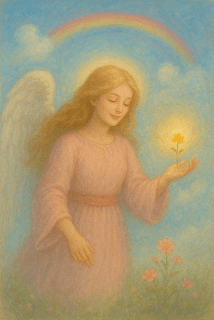 Prompt: This is an angel. She has got long, light yellow hair. She has got light pink clothes. There is a blue sky around her. There are clouds and a rainbow in the sky. The angel has got wings. She has got powers. She has got a healing power. She has got the power to grow flowers. There is a calm feeling in this picture. There are soft lights. The angel has got a happy look.