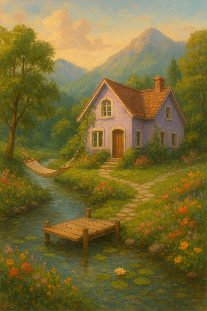 Draw a cozy and well-kept detached house in the mountains. There’s a small river nearby with flowers on its banks. A hammock is hanging by the river, and there’s a wooden dock on the water with water lilies. The path to the house is made of stone, and some parts are covered with ivy. The whole scene should feel comfortable ,peaceful and inviting, with beautiful ,warm and natural colors. It should look like a livable and attractive place that feels close to nature .
