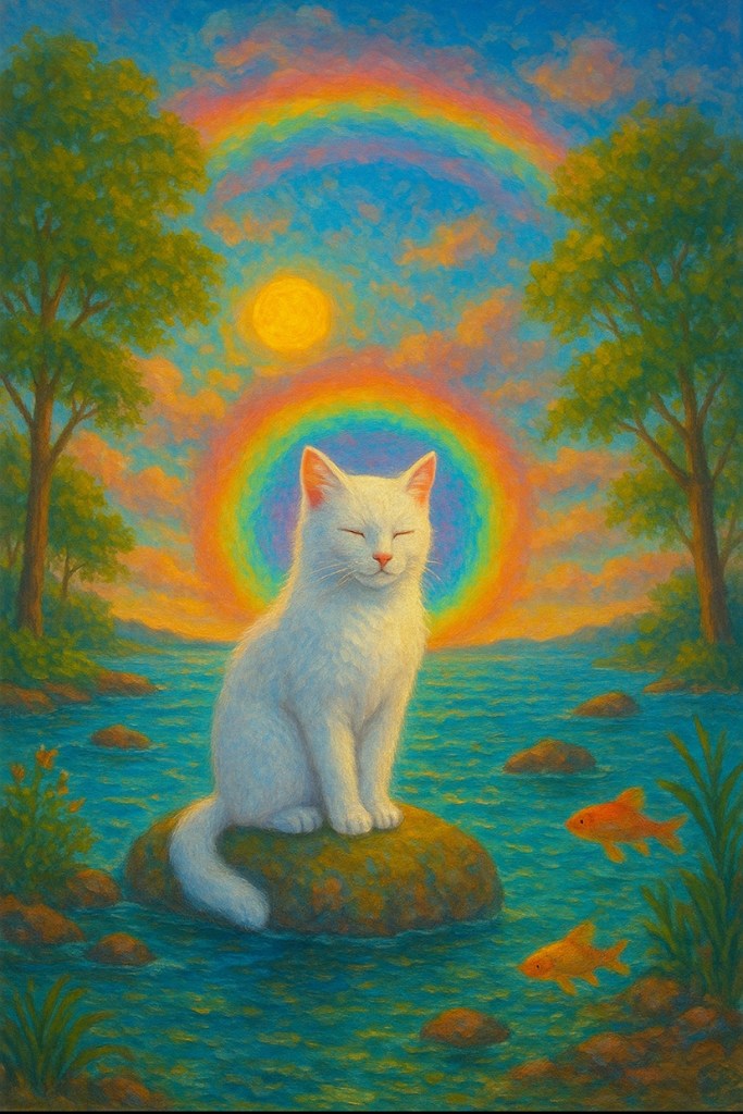 This is a beautiful picture. There is a calm white cat on a rock. The cat is peaceful. There is a colorful sea. In the clouds there is a big rainbow. The picture is very nice and colorful. The sun is rising. The sea looks nice. It feels calm and happy. There are some trees and fish. The photo gives good feelings.And cat so cutee.