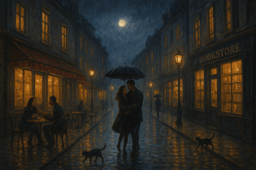 Prompt: I want to create a painting that represent me. İt is dark and cheerful. At night, the only lights are streetlights, the moon and the light coming from inside houses. I want the image of a street. I want cafes and bookstores. I want chairs in front of the cafes. I want lovers and cats having fun on this street. It is rainy but people are having fun in the rain the sky is just getting dark. Picture has peaceful and realistic atmosphere.