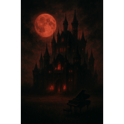I want a giant castle in a field. There are candles in the castle. Vampire lives in this castle. The castle is quiet and scary. Also, the castle feels royal and magic. There is a piano in the castle. There is a noon in sky. There are black and red colors in picture. Picture styles are dark and goth style.