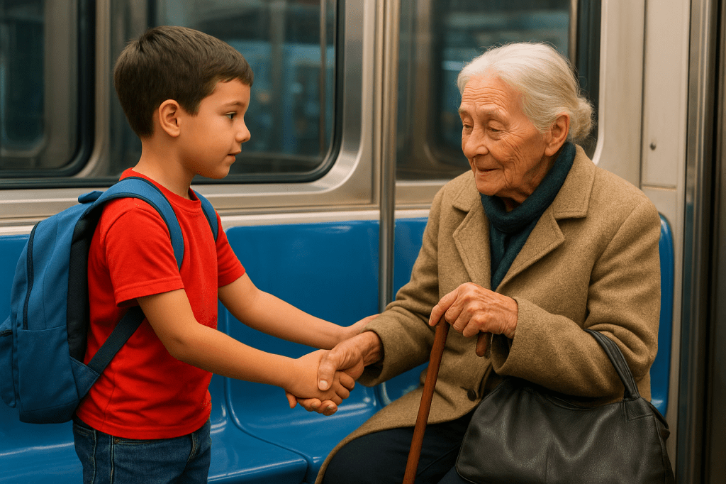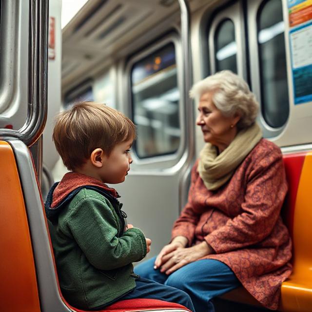 Prompt: Generate a primary school child giving his seat to an old woman on the subway is realistically depicted in sharp colors.