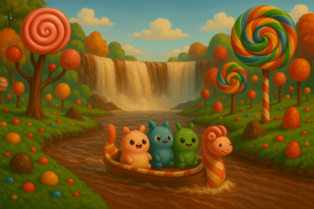 In this picture, there is a chocolate river and a big chocolate waterfall. There are many candy trees and lollipops around. Three cute colorful creatures are in a candy boat. One is pink, one is blue, and one is green. They are happy and smiling. The sky is blue and there are white clouds. Everything looks sweet, colorful, and fun. It is a magic world made of chocolate and candy.