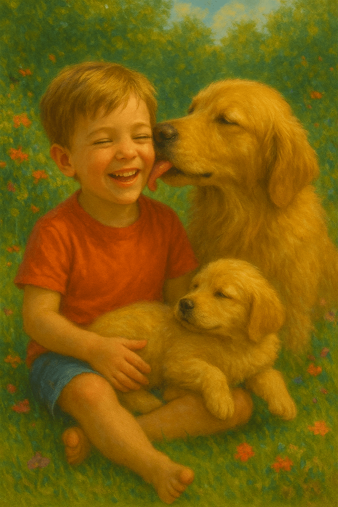 In a green garden, among colorful flowers, a child is sitting with a golden retriever puppy lying on their lap. The mother golden retriever is lovingly licking the child’s face. The child is laughing and looks very happy. The atmosphere is sunny and warm, with vibrant colors in a realistic style.