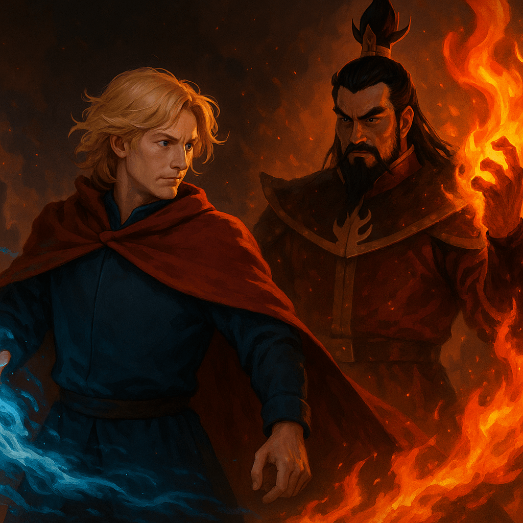He is a superhero. He has blonde hair and is tall. He wears a red cape. He is strong and brave. He can control air, water, fire, and earth. The Fire Lord is behind him. The Fire Lord is bad and dangerous. The hero fights him in the city. There is fire and light around