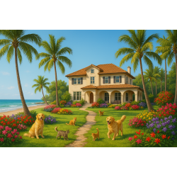 I want a big house, sunny and quiet, on the beach. The house is surrounded by palm trees. I have a big garden. My garden has colorful flowers, cats, and Golden Retrievers. My house is by the seaside.
