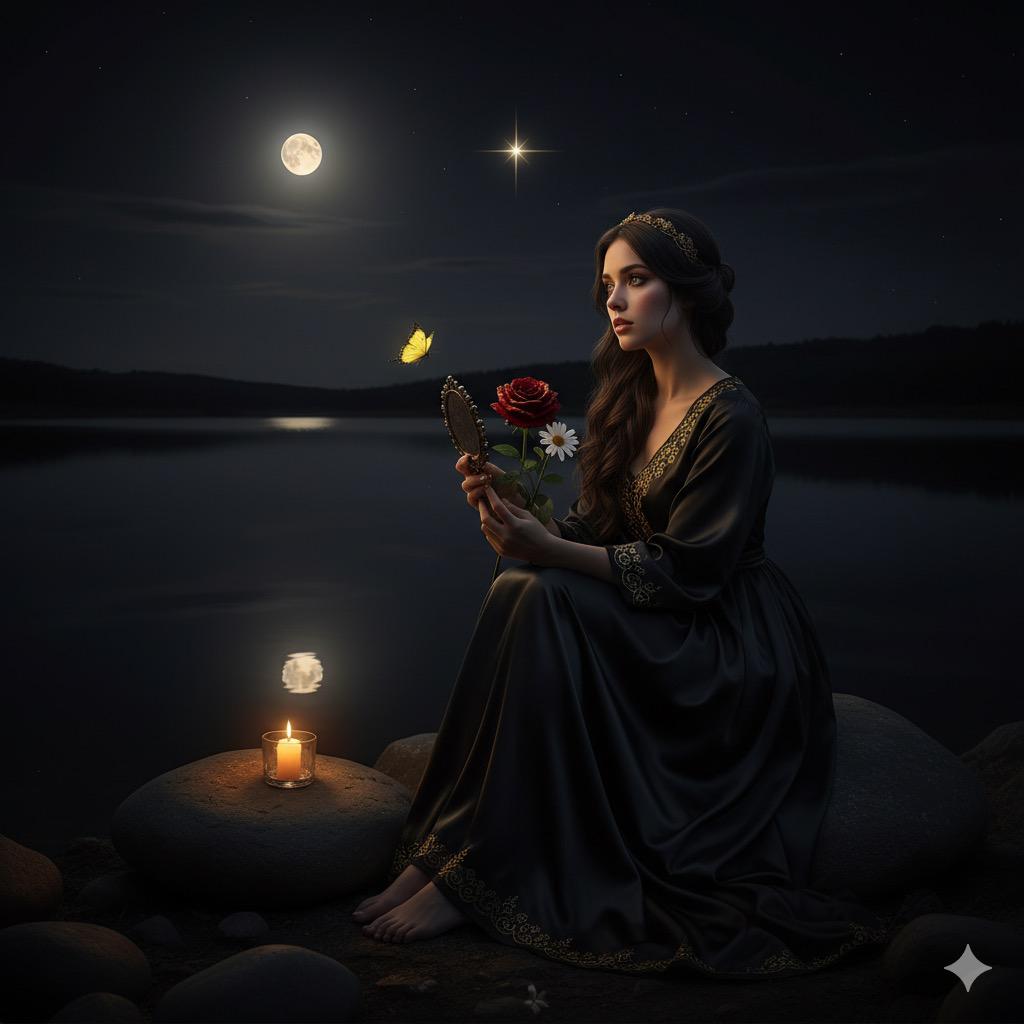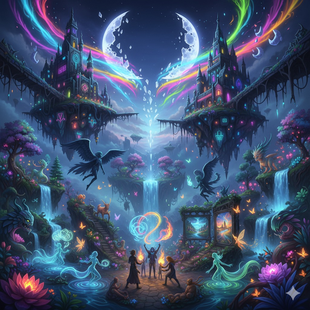 Prompt :”Deep forest at night, a glowing elf, a calm protective dragon, and a friendly mysterious vampire together near a small magical house with soft glowing lights, surrounded by tall ancient trees.